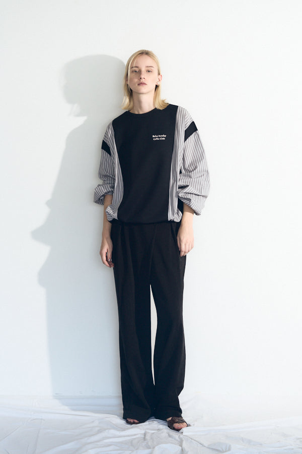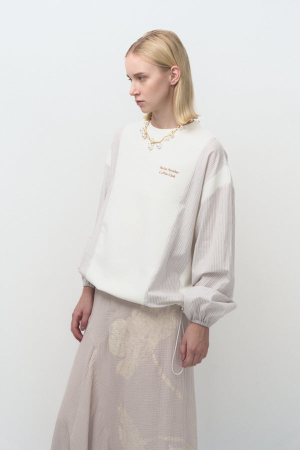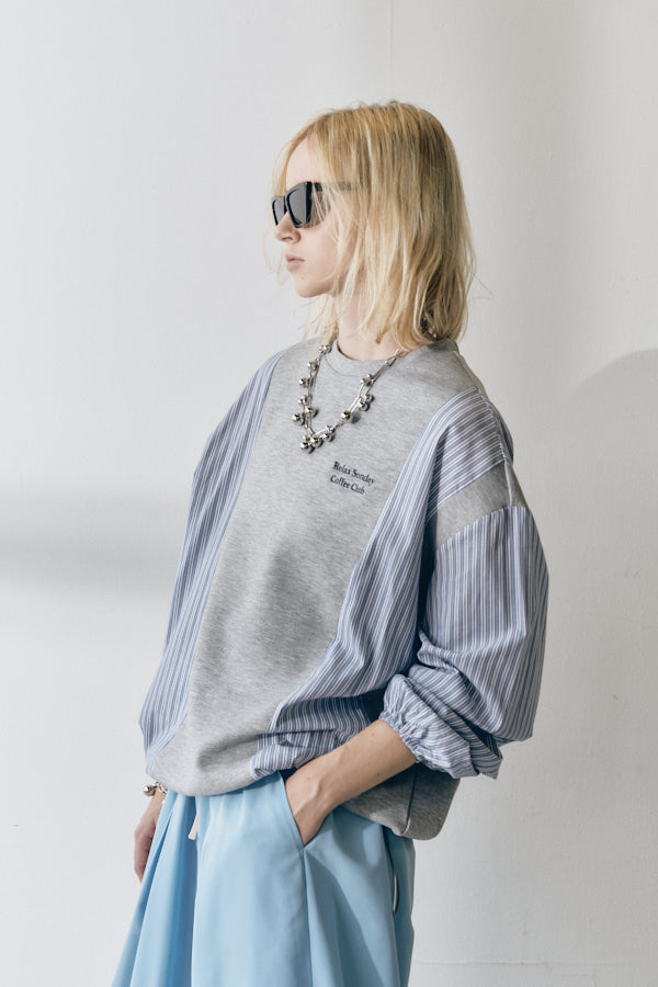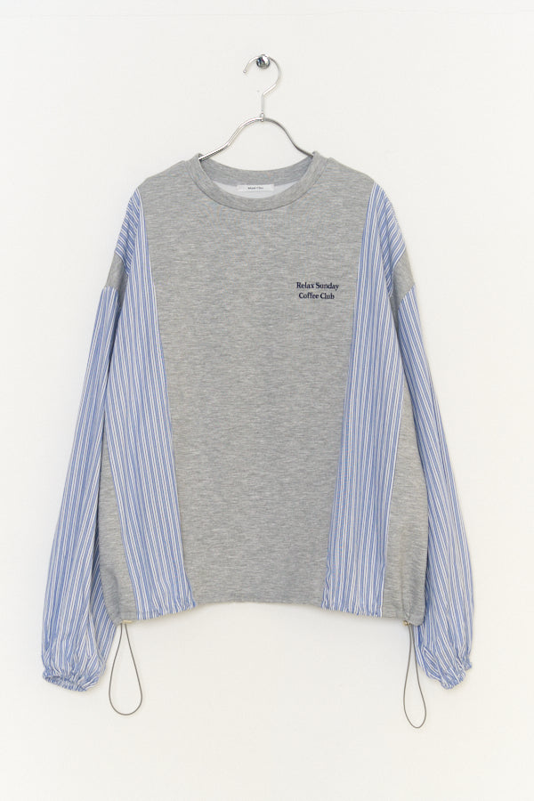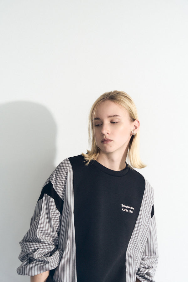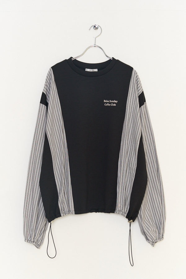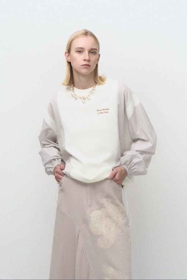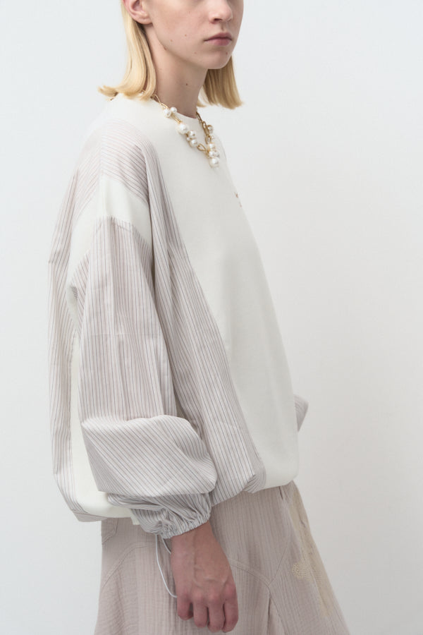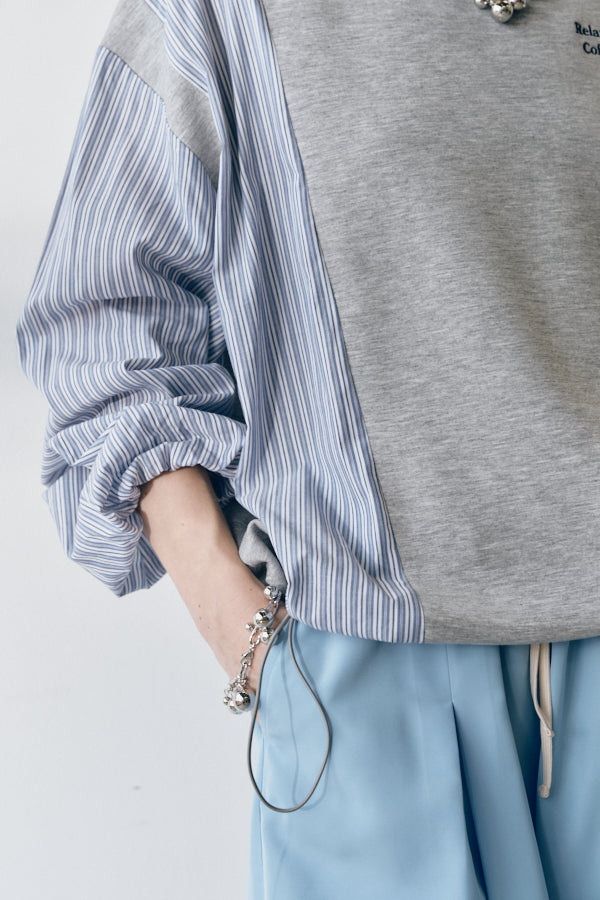 袖や身頃を所々切り替えストライプ生地を採用、ゆったりとしたシルエットと袖口のゴムで生まれる自然なボリューム感が特徴です。