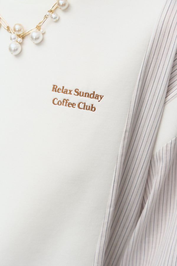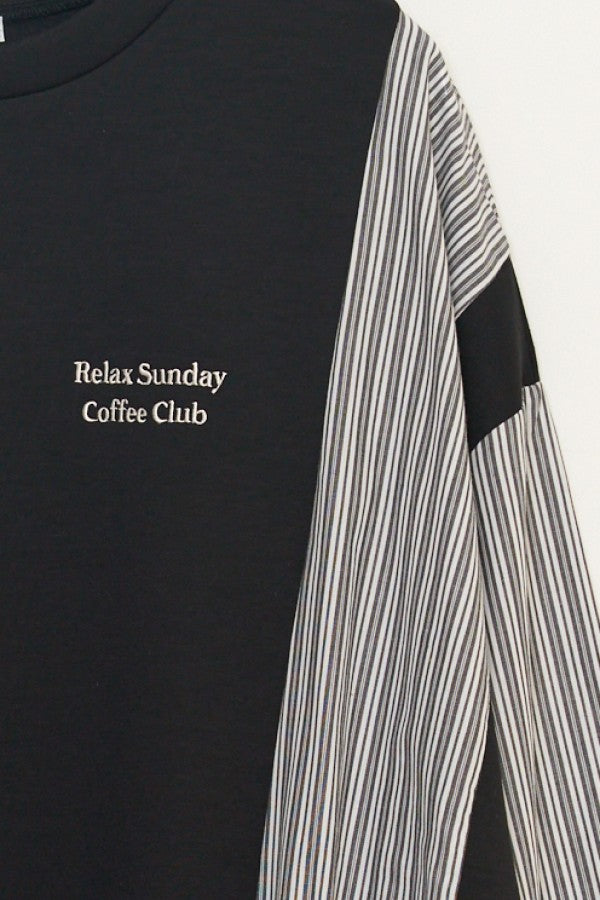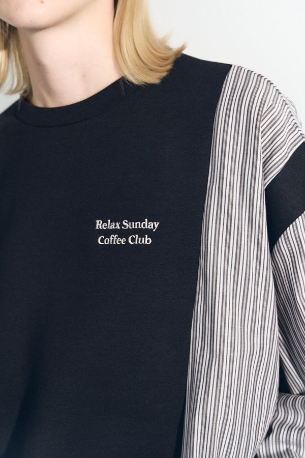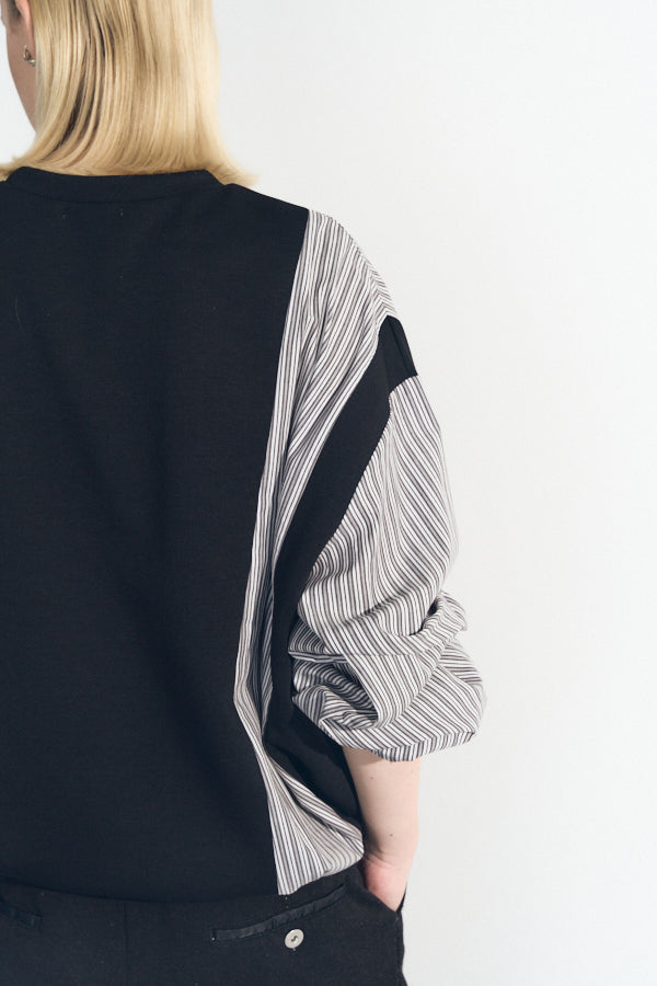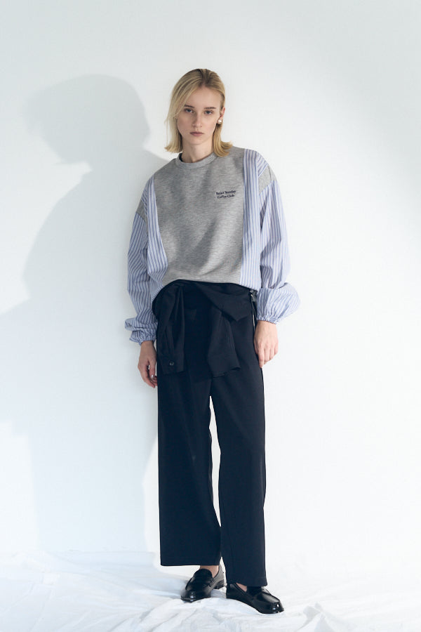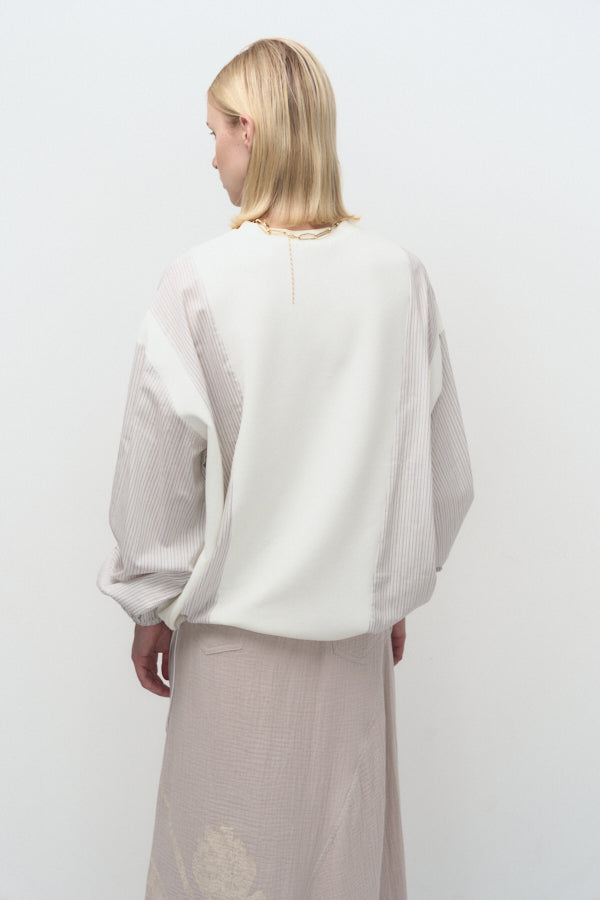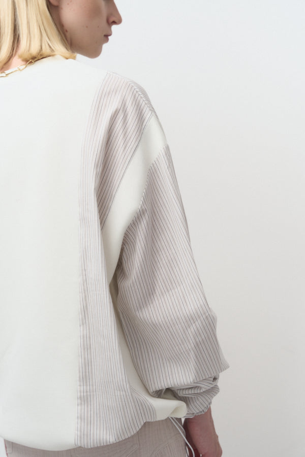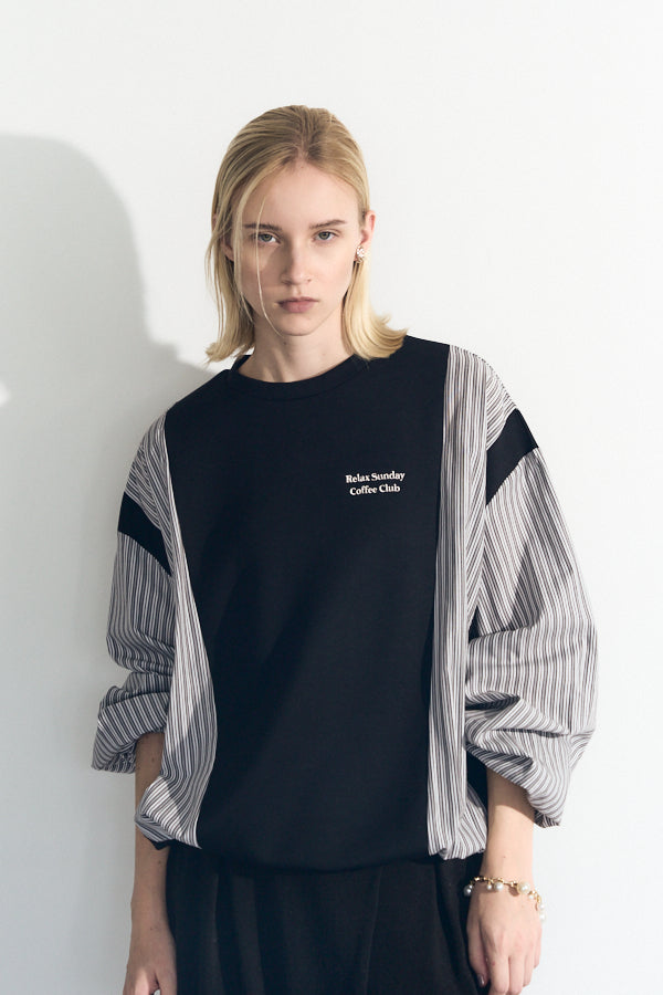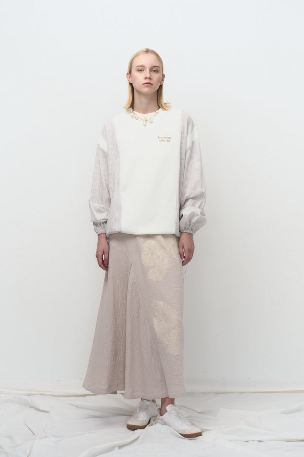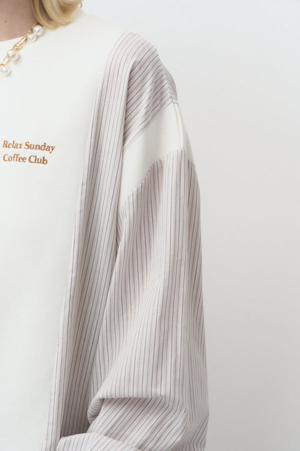 袖や身頃を所々切り替えストライプ生地を採用、ゆったりとしたシルエットと袖口のゴムで生まれる自然なボリューム感が特徴です。