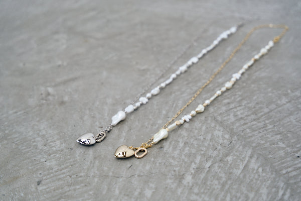 ハートモチーフと淡水パールを贅沢に組み合わせたチェーン。
